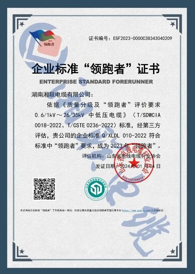 二月,企業(yè)標準領跑者管理信息平臺公布了2023年企業(yè)標準領跑者名單,湖南湘聯(lián)電纜有限公司憑借企業(yè)標準Q/XLDL 010-2022,成為2023年企業(yè)標準“領跑者”,湘聯(lián)電纜連續(xù)三年獲此殊榮。